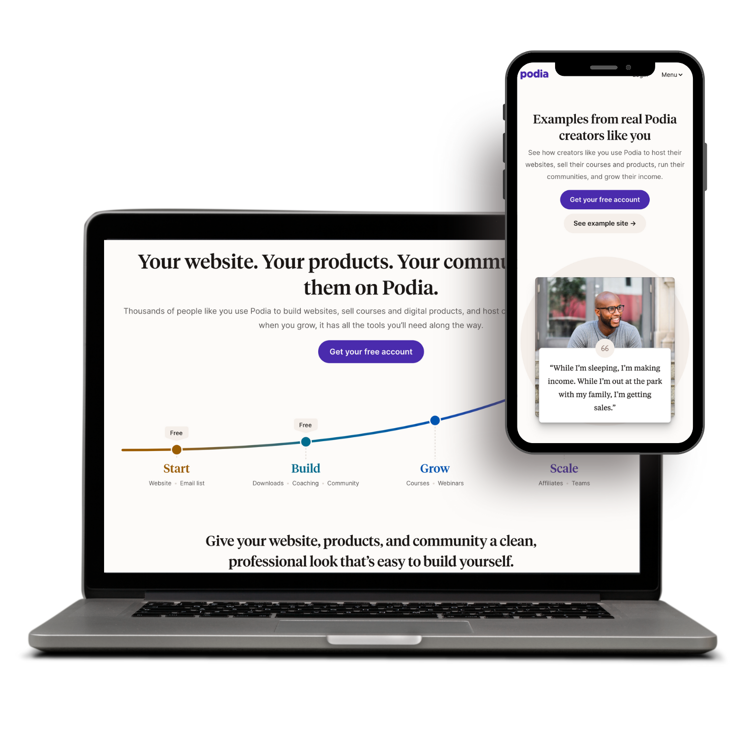Thousands of people like you use Podia to build websites, sell courses and digital products, and build a blog. Podia is free. And when you grow, it has all the tools you’ll need along the way.
